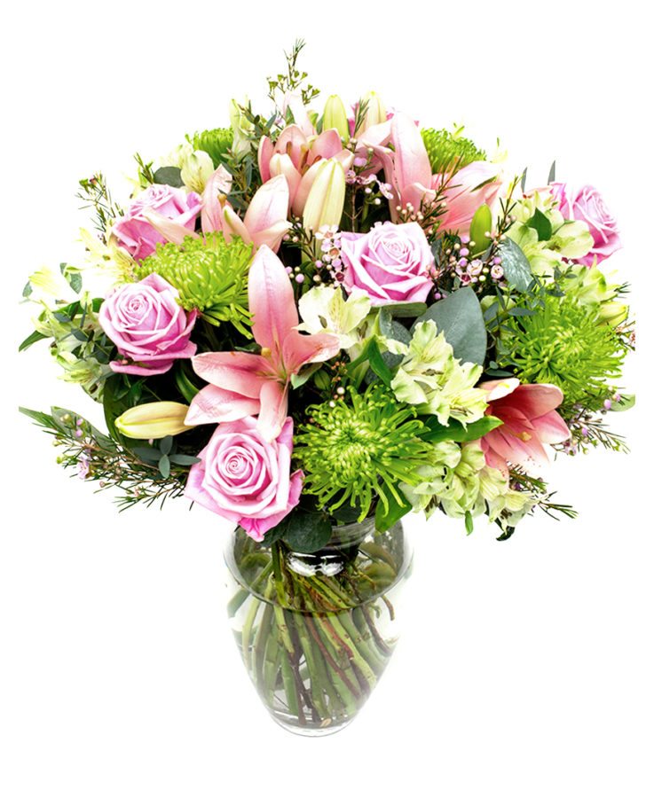 TO INCLUDE: Alstroemeria, Shamrock Chrysanthemum, Wax-Flower, pink Lilies, and pink Roses with foliage.