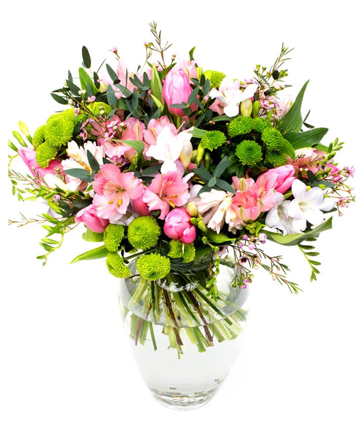 TO INCLUDE: Alstroemeria, Chrysanthemum, Freesia, Hyacinths, Tulips and Waxflower with Eucalyptus and Salal.